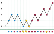x轴为计数器中存储的元素,而下方y轴为输入的元素序列。遇到相同元素或者计数器中没有元素,计数器加入重复元素,如果遇到不同元素计数器消除一个元素。