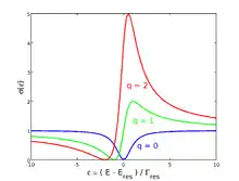 不同参量q下的非对称法诺线形。縱轴是散射截面,纵轴則代表归一化的能量。