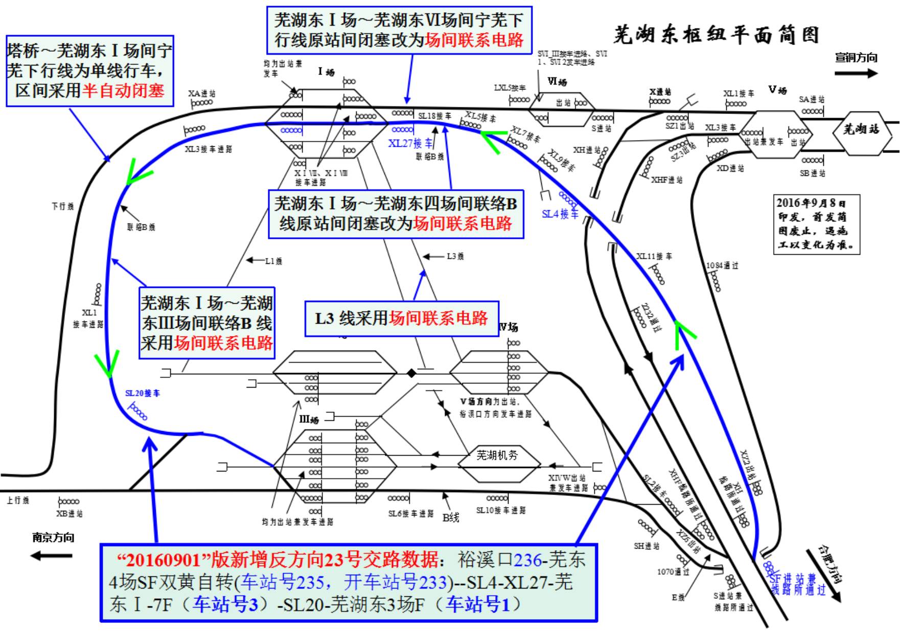 芜湖东站在2016年淮南铁路电气化时进行了进一步的改造,包括修建湾里便线工程、站场信号改造、I场、IV场、VI场电气化改造等工程[7]。其中,湾里便线于2016年8月30日开通[8];I场、II场、III场信号工程于2016年9月开通[9];Ⅳ、Ⅴ、Ⅵ场信号改造则于2016年11月11日完成[10],