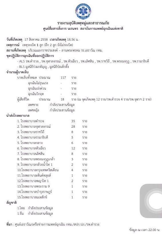 - National Institute for Emergency Medicine. [Mass casualty and disaster report]. 2015-08-17 [2015-08-17]. (原始内容存档于2016-09-15) (泰语).